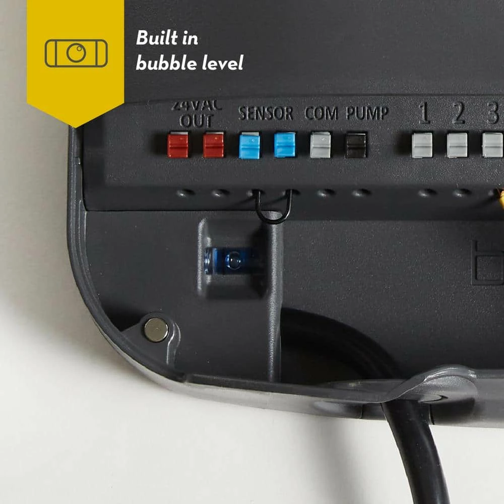 The Orbit B-hyve XR Smart Sprinkler Timer brings innovation to a new level. B-hyve timers allow you to control your watering from anywhere in the world on your iOS or Android device or via the web app while saving water and lowering your water bill. WeatherSense technology uses advanced local weather data automatically creating watering schedules that deliver the right amount of water to your plants, avoiding any water waste. This sleek, indoor/outdoor smart timer is fully weather-resistant without the need for a costly additional weather enclosure. 3 full-color digital displays and a multi-color LED light ring allow you to see exactly what the timer is doing in an instant. Fully equipped with dual-band (2.4 GHz and 5.0 GHz) Wi-Fi, a long range Bluetooth (BLE 5) radio, and an internal, plug-and-go transformer. The push-and-go wiring terminals and built-in bubble level make installation quick and easy.