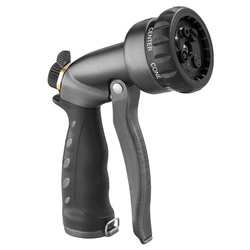 This front trigger nozzle provides ease of use with 7 spray patterns for various watering needs. It includes a flow control lever, easy to use front trigger, and locks for constant spray. Patterns are Mist, Shower, Flat, Jet, Center, Cone and Flood.