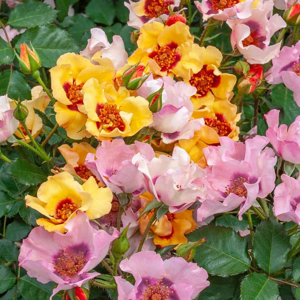 In Your Eyes Shrub Rose produces big clusters of extraordinary, multi-color, pastel blooms. They’re extraordinary because they start out creamy yellow with a red eye and then mature to lavender with a purple eye. As each bloom goes through this color change in its own time, the clusters morph through a changing blend of lovely pastel hues. Producing mildly fragrant blooms, this shrub rose is tough, disease resistant and wildly productive.
