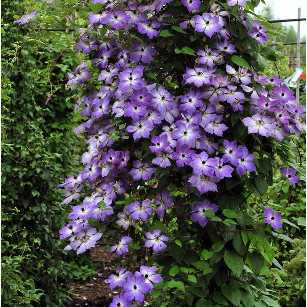 Cloudburst Clematis is a heavy bloomer, breaking out in early summer with purple-blue blossoms with pale, delicate centers and darkly veined petals. Like a cloudburst, blooms appear in sudden profusion from early to midsummer and then continue blooming more moderately until fall. This latest cultivar from Szczepan Marczynski’s collection has flowers that are 4 in. W to 5 in. W and have slightly wavy edges.