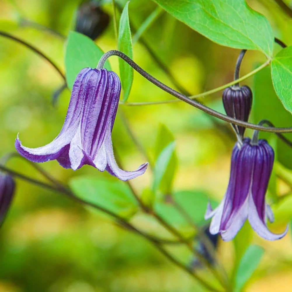 Clematis Roguchi is a non-vining clematis that features bell shaped flowers, that have a bluish-purple color. When summer comes, hundreds of these beautiful flowers cover the plant, giving great color to a border. Because Roguchi is a non-vining Clematis that you can let it grow amongst your perennial plantings providing a wonder contrast of color and height.